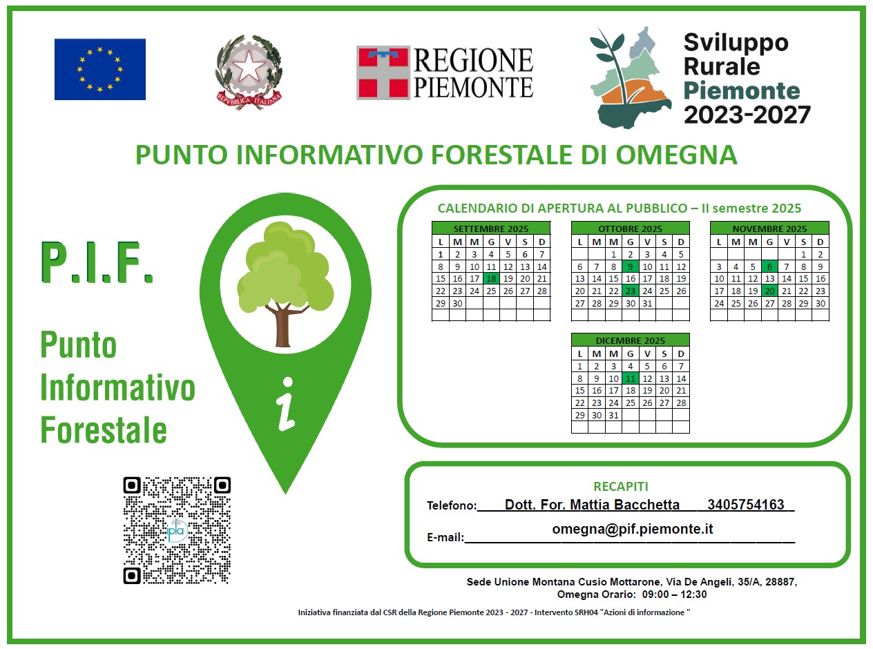 Si informa che dal mese di GENNAIO 2026 è stato riaperto al pubblico il Punto Informativo Forestale di Omegna, per fornire consulenza in campo forestale ed ambientale ad utenti privati, aziende ed enti pubblici.